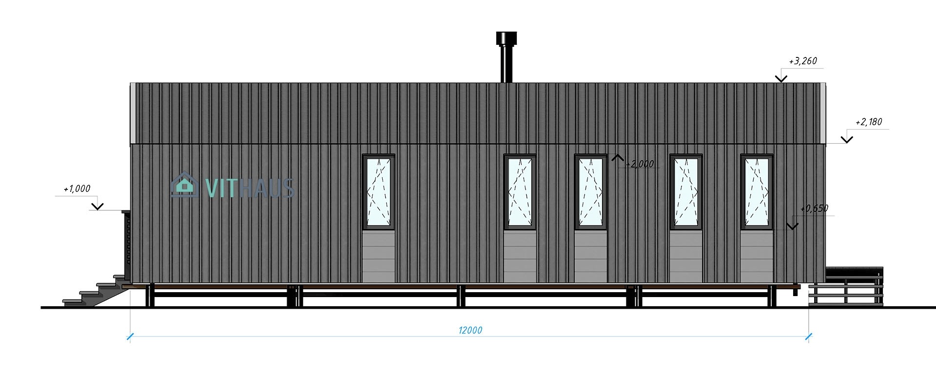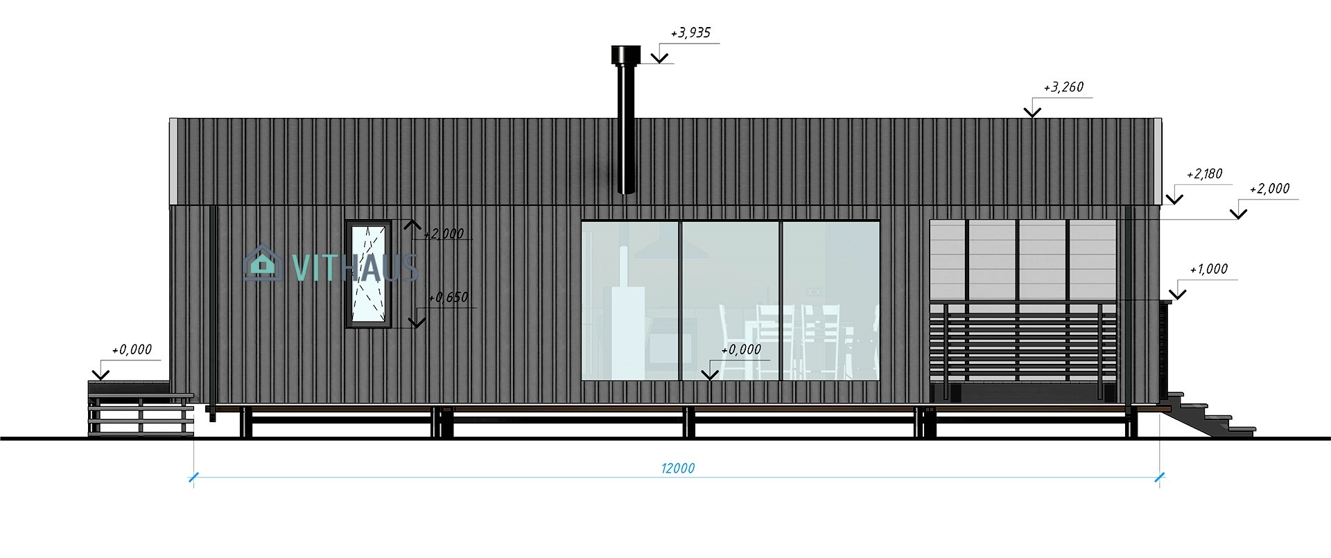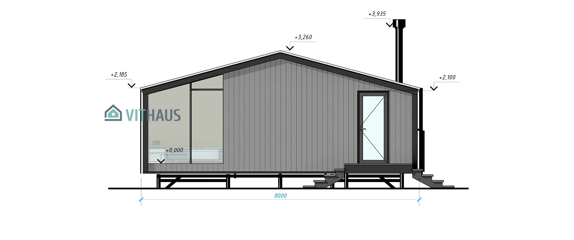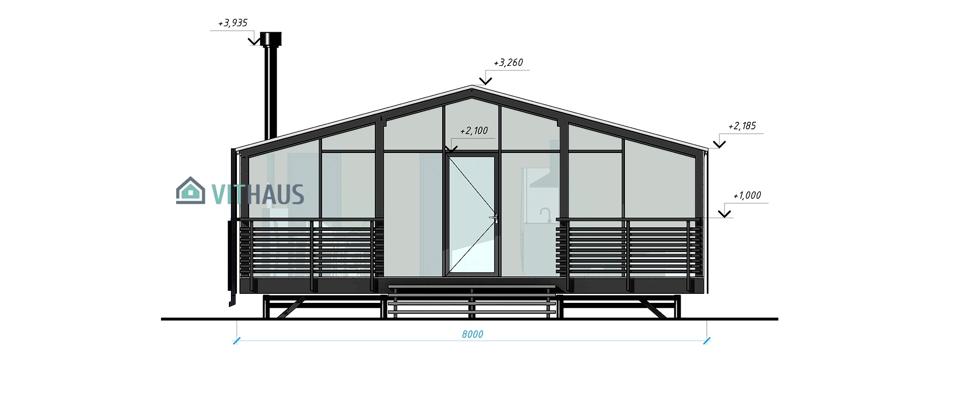 We recommend that Dublhaus 65 be completed with a large veranda in front and a small in rear for access to the backyard from the bedrooms. Different projects include entrances from different sides: front through the veranda, behind or on the side – through the high module.